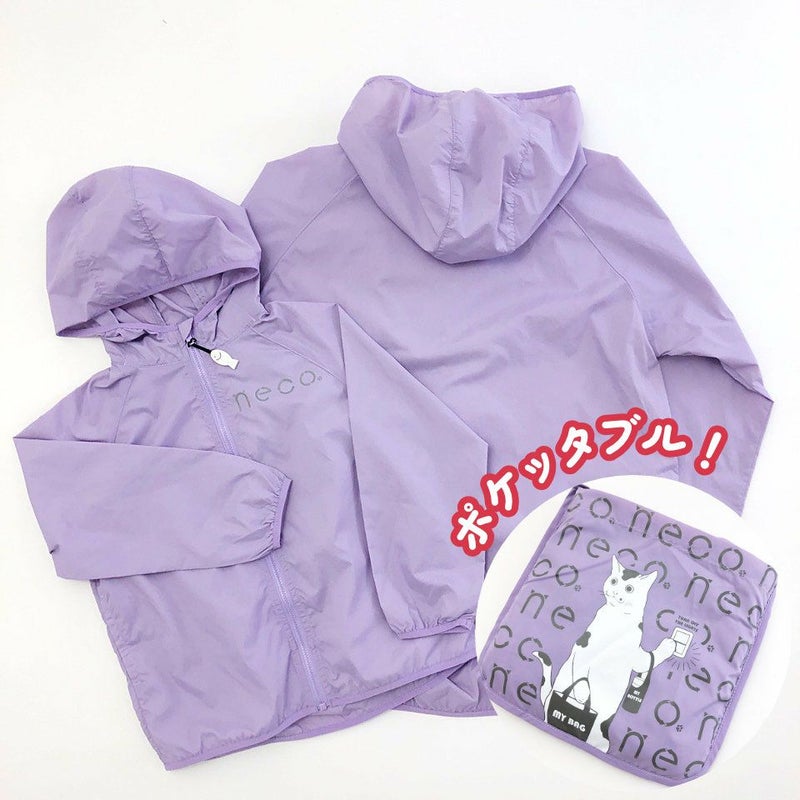 コンパクトに持ち運べて使い勝手の良い「ポケッタブルジャケット」が登場! はっ水加工でちょっとした雨やアウトドアにも便利なジャケットは、 シンプルなデザインで年齢・性別問わずご着用いただけます。 ポイントはジャケットの内側に付いている収納ポケット。 ジャケットと一体型なので袋だけをなくしてしまうという心配が無く、 いつでもさっと畳んでコンパクトに持ち運べます。 バッグの中に一枚入れておけば、急な雨や肌寒い時にも頼りになります。 トレンド感のあるラベンダーの生地に、胸元の「neco」はリフレクター素材、 ファスナーには魚のチャーム付き。 収納時にはecoなnecoがインパクト抜群! ギフトにもオススメです♪ 中国製