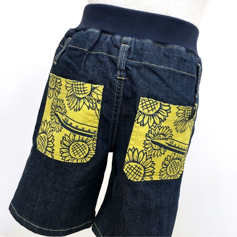 BLACKOJICOのデニムハーフパンツに新柄登場です☆ ワンウォッシュの風合いが素敵なデニムハーフパンツは、ストレッチ性のある素材を使用しているので履きごこちも柔らか♪ウエストには幅広のリブ使用で履きやすさバツグンです☆ 後ろポケットのひまわり柄プラスドクターイエローが個性的☆ 初夏から秋口まではこれ1つで、秋冬はスパッツを合わせても素敵なデニムハーフパンツ。1年中大活躍してくれます☆