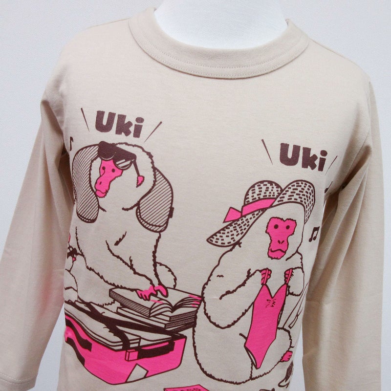 ウキウキのおさるさんが楽しい長袖Tシャツ「HIKOUKKI(ひこうっきー)」♪ フロントではおさるさん一家が楽しい旅行の準備中☆ 水着やサングラスを用意したり、ガイドブックにふせんを貼ったり、とっても楽しそうです♪ バックでは飛行機に乗ったおさるさん一家。 飛行機に乗ってうっきうきです♪ ※この商品はwebと一部店舗で取扱い中です。
