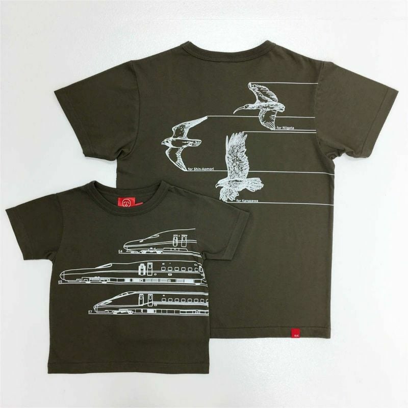 フロントにはE4系、E5系、E7系の新幹線。 バックには鳥のとき、はやぶさ、はくたかが飛んでいます♪ 新幹線好きには堪らないデザインです! 「4+5+7」を着て今日はどこに行こうかな♪ JR東日本商品化許諾済