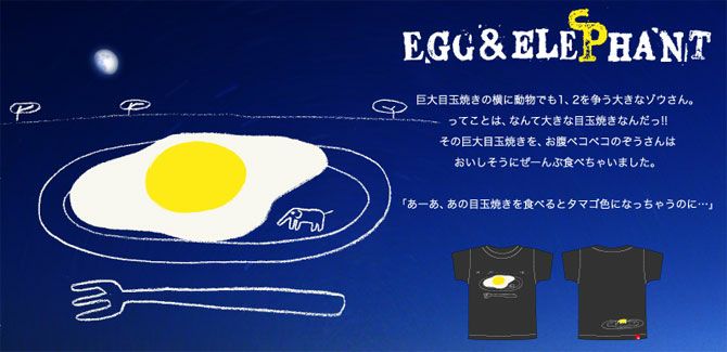 かわいく着こなせる人気の一枚"EGG&ELEPHANT"♪ ゾウよりも大きい目玉焼きのプリントが目を引くかわいいデザイン。 バックには目玉焼きを食べて黄色くなったゾウがとてもコミカルでおもしろいストーリー。 「巨大目玉焼きの横に動物でも 1、2を争う大きなゾウさん。 ってことは、なんて大きな目玉焼きなんだっ!! その巨大目玉焼きをおなかペコペコのゾウさんは おいしそうにぜーんぶ食べちゃいました。 「あーあ、あの目玉焼きを食べると タマゴ色になっちゃうのに…」」