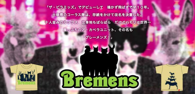 フロントにはタキシード姿の4人組。そしてバックにはグリム童話でお馴染みの4匹のシルエット。 もしも彼らがブレーメンまで辿り着いたなら…? 今日も彼らはマルクト広場で世界一のハモリを響かせていることでしょう♪ 「ザ・ピラミッズ」でデビューして 鳴かず飛ばずで早10年。 土俵際のコーラス隊は、 存続をかけて改名を決意した。 十人並みのルックス 出身地もばらばら だけどハモリは 世界一 崖っぷちのア・カペラユニット、 その名も「ブレーメンズ!」