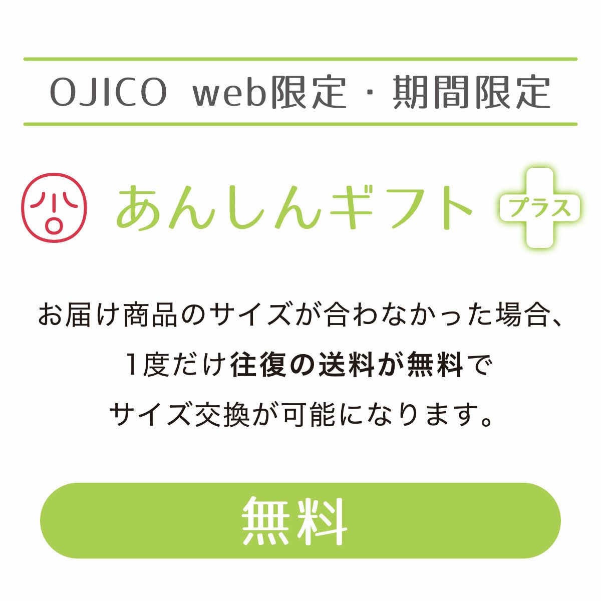 【無料】 【対象期間:11月19日(水)〜12月25日(木)】 サイズ交換となった場合の「往復の送料」が無料になるチケットです。 ギフトで贈った商品のサイズが合わない場合、このチケットで1度だけ無料で交換できます。 ※サイズ交換受付期限:2026年1月15日(木)まで ※往復の送料のみ無料となります。サイズ交換により商品の差額が発生した場合は、別途ご請求またはご返金いたします。その際の振込手数料はお客様負担となります。 ※サイズ交換のみお受けいたします。デザインの変更や別の商品への変更はいたしかねます。 ※ご希望のサイズ・カラーが完売している場合や次回入荷がない場合は、誠に恐れ入りますがご交換対応いたしかねます。 ※サイズ交換チケットの案内に記載の条件を満たしていない場合はサイズ交換不可となり、着払いでご返送いたしますことご了承ください。 ※フクブクロ・セール品は対象外です。
