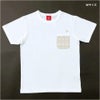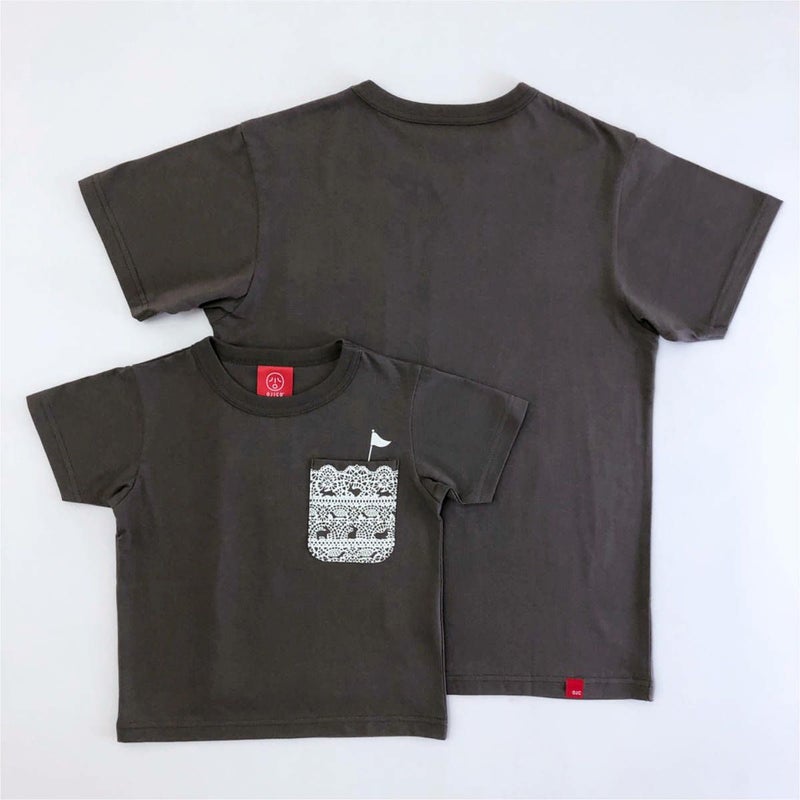 シンプルで可愛いポケットデザインのTシャツが登場♪ デザインは、レース柄のポケットのみなのでシンプルに着やすい1枚♪ レース柄をよく見るとウサギとカメが競争(race)しています♪ 疲れたウサギはウトウト・・・・ 地道に歩いてゴールしたポケットの中のご機嫌なカメをご覧ください♪
