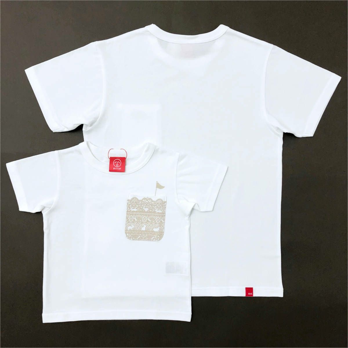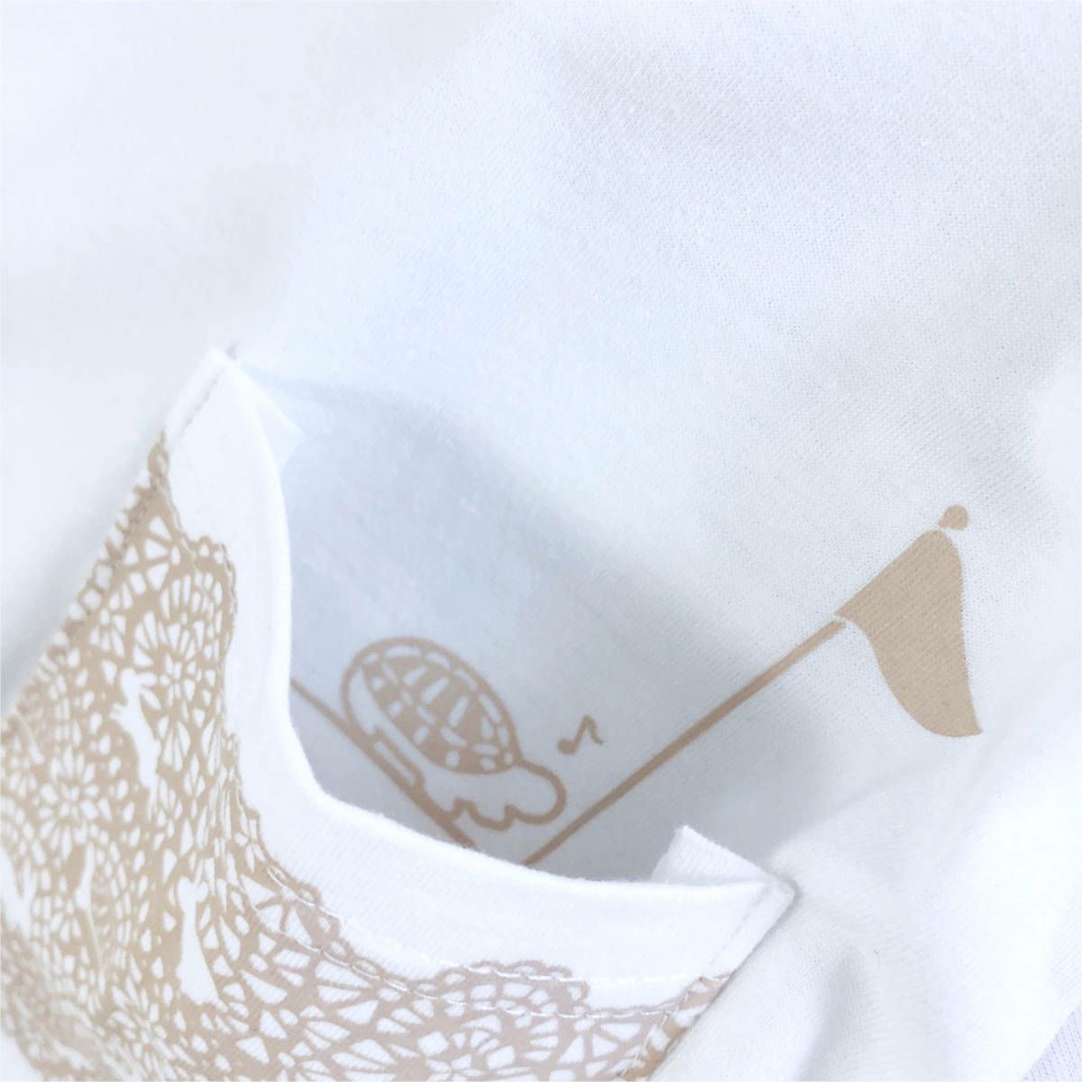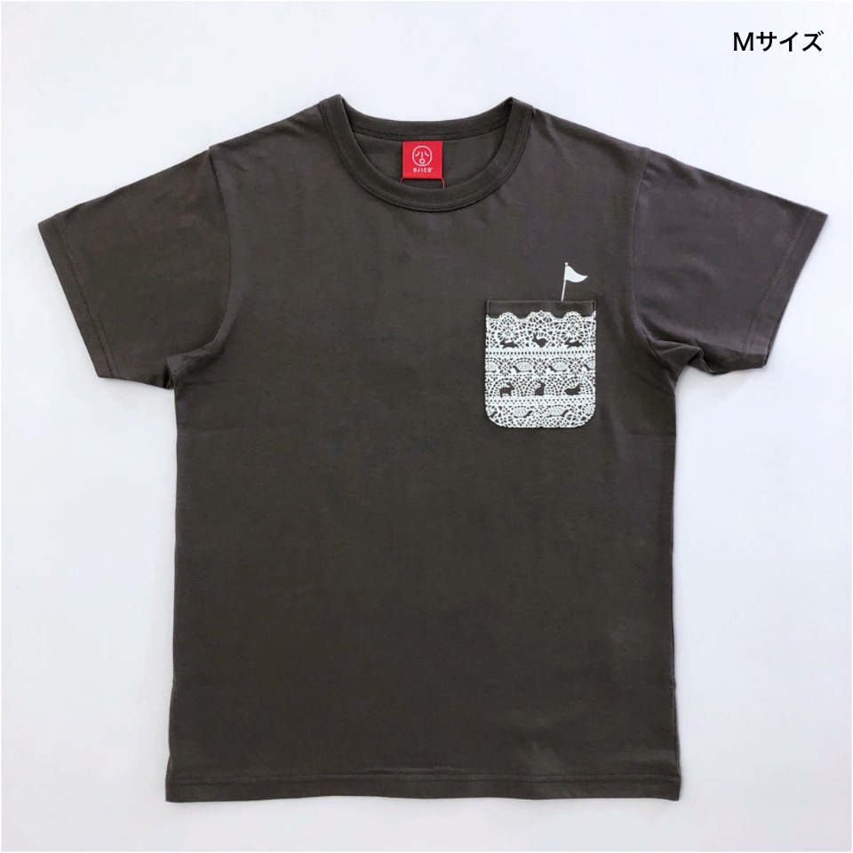 シンプルで可愛いポケットデザインのTシャツが登場♪ デザインは、レース柄のポケットのみなのでシンプルに着やすい1枚♪ レース柄をよく見るとウサギとカメが競争(race)しています♪ 疲れたウサギはウトウト・・・・ 地道に歩いてゴールしたポケットの中のご機嫌なカメをご覧ください♪