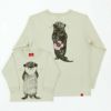 フロントには手を後ろに回して首を振っているかわうそ。ちがうよと言っているみたいですが…口元には何か付いていますね。 バックにはかわうその後ろ姿。食べかけのドーナツを手に持っていますね!かわうそがウソついちゃったみたいです♪ 袖口リブ付にリニューアルした長袖Tシャツは大きめサイズでも手元がすっきりと見え、手を洗ったり、腕まくりをする際にも便利になりました♪