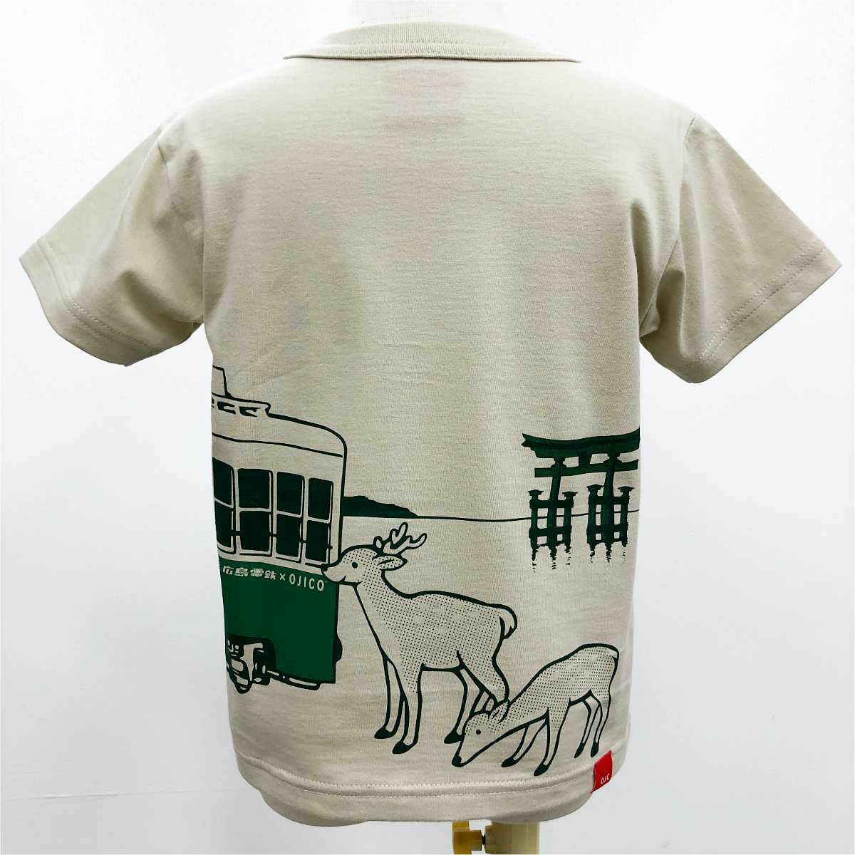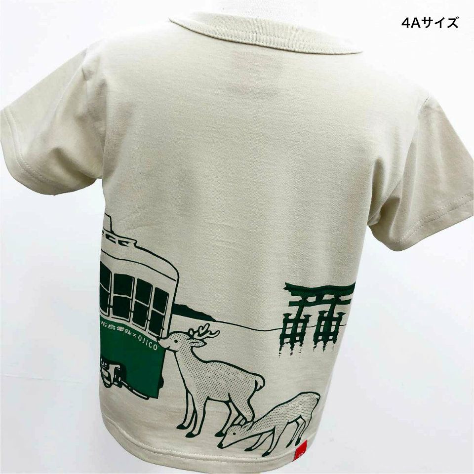広電×OJICOの半袖Tシャツが登場☆ Tシャツのフロントからバックまで車両が繋がっています! 大鳥居をバックに宮島から広島駅へ向かう350形車両を鹿たちも見送っています♪ 友達や家族とおそろいをお楽しみください♪ ※広島電鉄商品化許諾済