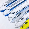 東海道新幹線の歴代の車両とドクターイエローが勢ぞろい! バックを見ると、最新型のリニア中央新幹線L0系が 「I'm here too!」(私もここにいるよ!)と、ひっそり主張しています! JR東海承認済 JR西日本商品化許諾済