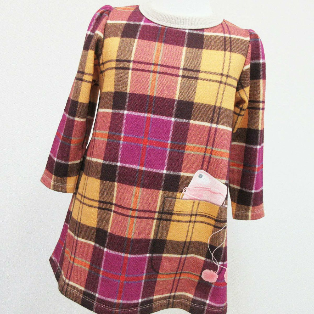 チェック柄のかわいらしいスウェットワンピース♪ ウールチェックプリントなのでやさしい、温かみのある風合いに仕上がっています。 本物そっくりに見えますが、実はこのウールチェックはプリントです☆ チェックだけでも十分かわいいですが、 なんと、スマホがポケットからひょっこりフォン! このスマホ、結構リアルなので、少しお姉さん気分になれます♪ さらにサイドには本物のポケットが付いています♪ どっちの色を選んでもかわいいチェック柄なので、 スパッツやタイツと合わせるだけで◎!